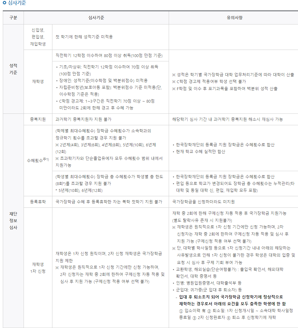• 기초, 차상위 학생들은 직전 학기 12학점을 이수하고 70점 이상을 취득해야 기준에 만족합니다.