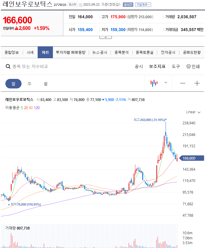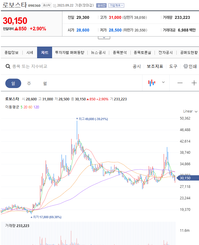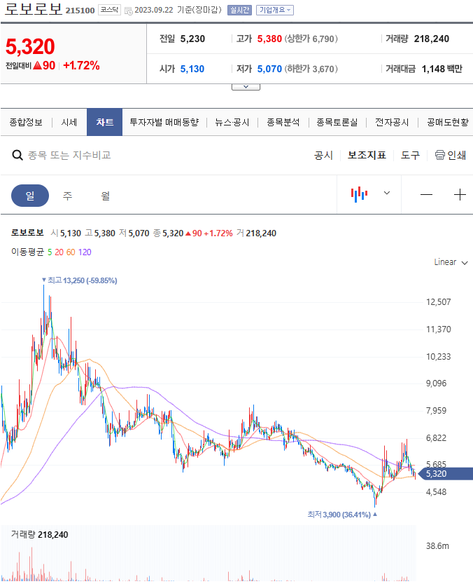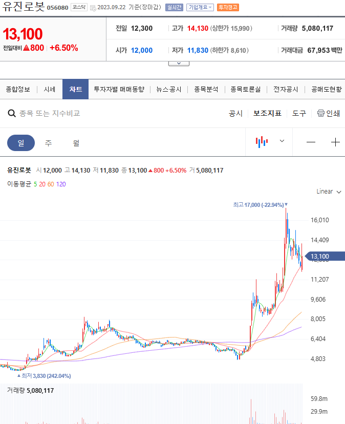 최근 3월부터 로봇주는 각광받으며 상승세를 타다가 조정 기간을 약 2달 정도 갖고 8~9월부터 다시 두번 종도 상승 파동을 보이며 올라가다가 다시 조정을 받는 추세입니다.