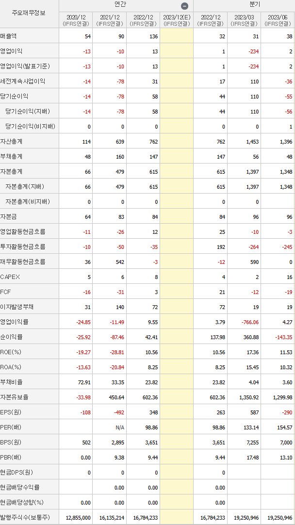 수익은 적자를 벗어나 23년도 흑자로 탈바꿈하며 자산과 자본금이 꾸준히 증가하는 모습을 보이고 있습니다. 시가총액은 3조 2천억원 정도인데 영업활동현금흐름이 12억인 것을 감안하면 아직 수익, 매출면에서 좀 더 성장해야할 것으로 보입니다.