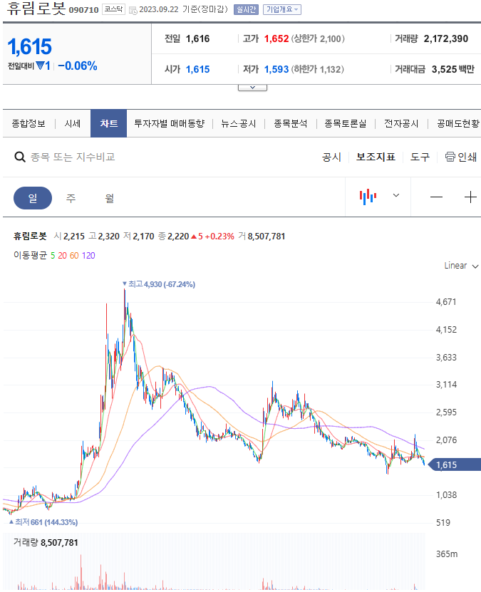 동사가 생산하는 제조업용 로봇은 직각좌표로봇, 수평다관절로봇, 데스크탑로봇, 반도체용 로봇, 리니어스테이지 등이 있습니다. 로봇 관련주가 워낙 많다보니 각광받지 못하는 기업도 있는데 휴림로봇의 경우 아직 재무제표가 적자를 벗어나지 못했고, 수익 면에서도 다른 대장주에 비해 개선이 되지 않아 주가가 정체 중인 것으로 보입니다.