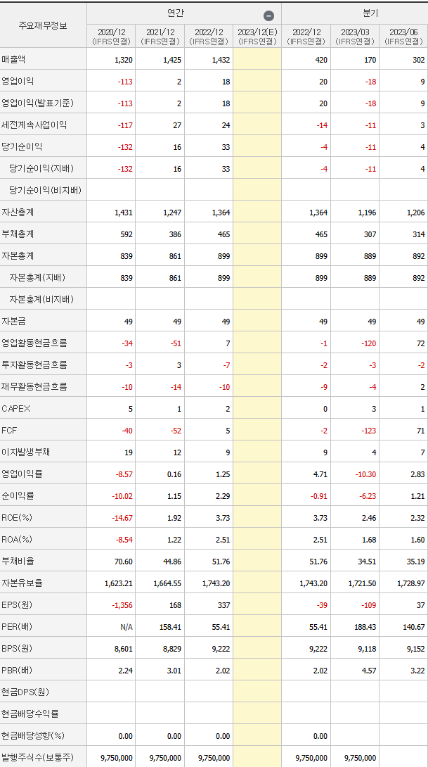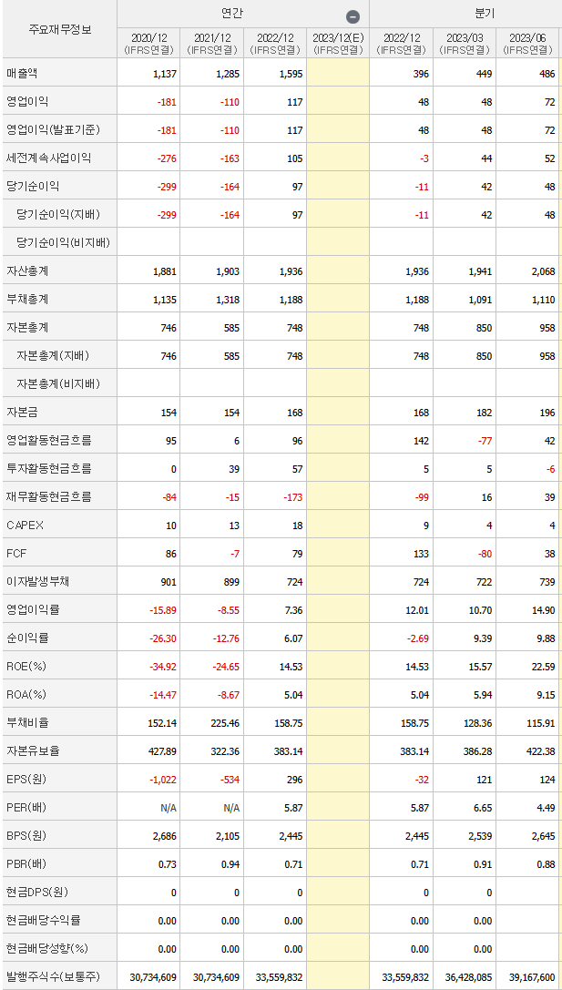 올해 포함해서 내후년부턴느 좀 더 가파른 성장세를 보이지 않을까 싶습니다.20년에 적자가 굉장히 심했었는데 22년부터 개선되는 모습을 보여주고 있고 영업활동현금흐름 역시 22년 흑자로 돌아서면서 올해 얼마나 개선될지 지켜봐야할 거 같습니다. 1, 2, 3분기를 봤을 때 아직까지 성장이 급성장을 한 것으로 보이진 않고 둔화 정도로 보입니다.