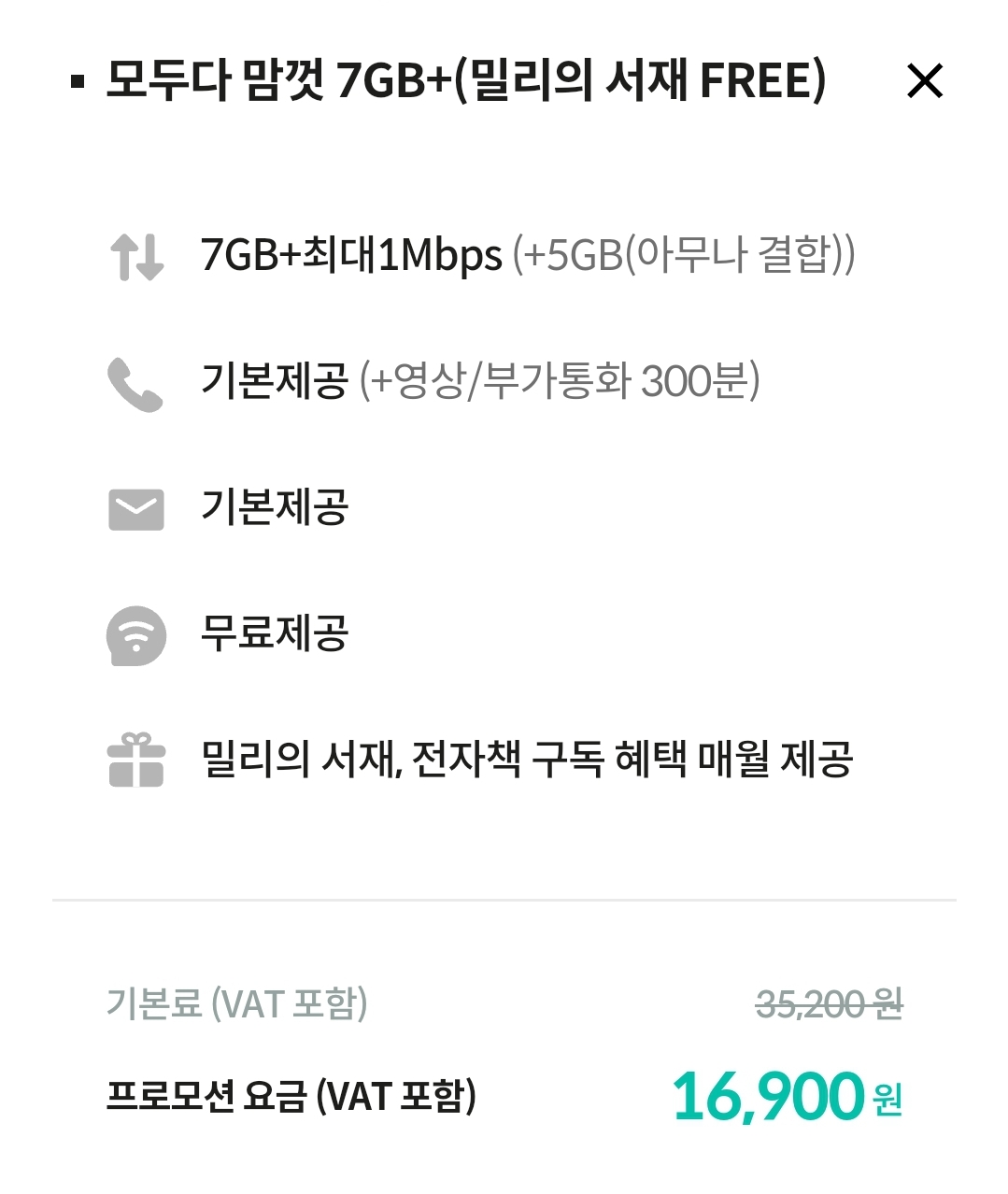 - 요금제 16900원 : 7GB + 소진시 1Mbps + 5GB(아무나 결합시)