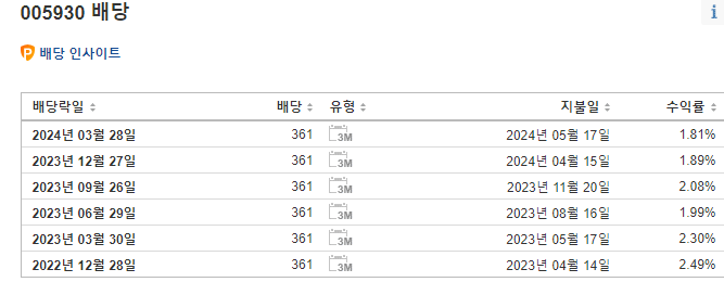 | 배당금 지급일 | 24년 5월 중순 | 24년 8월 중순 | 24년 11월 중순 | 25년 4월 중순 |