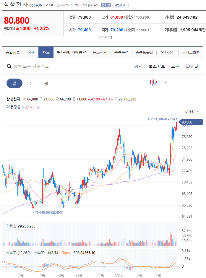 24년 10월 말에 코스피가 바닥권을 다져주면서 23년 동안 꾸준한 상승 추세를 보여주었는데요. 삼성전자 역시 23년 11월부터 천천히 보합권을 보이다가 24년 새해에 8만원을 뚫었습니다. 하지만 금세 힘을 못 받고 흘러내려 7만원 대에 머물러 지지부진했습니다. 하지만 현재 AI 수요 증가, 금리 인하 기대감, 외국인 삼박자가 맞기 시작하면서 8만원을 뚫어주었습니다. 향후 금리 인하와 경제 방향성에 따라 달라질 순 있겠지만 뉴스에 따르면 바이든 당선 여부도 영향을 미칠 것으로 보입니다.