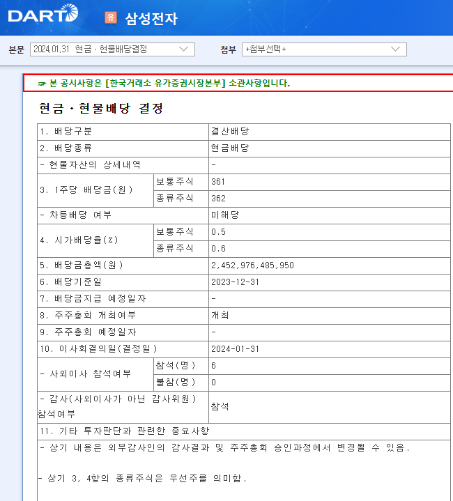 다트 공시에 올려진 삼성전자 현금, 현물 배당 결정을 보면 다음과 같으니 사진을 참고하시면 될 거 같습니다. 우선 삼성전자의 배당금은 1주당 361원입니다. 배당율로 따지면 총 4번 들어옴으로 1.85~2%가 삼성전자 연간 배당율이라고 할 수 있습니다. 수익률로 먹을 것이 아니라면 배당으로 봤을 때 절대 높은 수익율이 아니기 때문에 더 높은 이자를 원하신다면 공부를 통해 향후 주도주에 장기 투자하시는 게 어떨까 싶습니다.