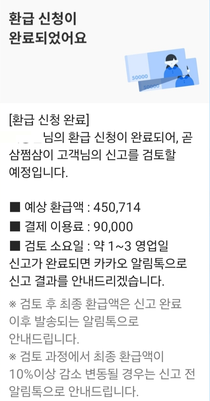 저의 23년도 돌려 받을 환급액인 약 45만원이였습니다. 생각보다 짭짤한 돈에 신청하길 잘했다는 생각이 들더라고요. 다만 아쉬운 점은 수수료가 20%나 되더라고요. 수수료 범위가 15~20%라고 되어있던데 무슨 범위 기준으로 이렇게 많이 떼가는지는 모르겠습니다. 잠결에 신청하다보니 카드 결제를 해버렸는데 생각해보니 토스 세이브잇이 더 수수료가 싸다고 하는 거 같아서 환불신청을 해버렸습니다.