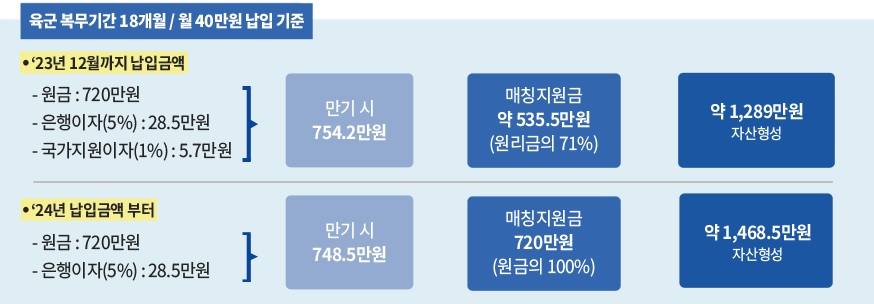 또 다른 예로 24년부터 월 40만원 납입한다고 가정하면 원금 720만원에 은행이자 28.5만원 그리고 나라에서 매칭지원금(원금 100%) 720만원을 더하면 약 1,468만원을 받을 수 있습니다. 얼마나 늘었는지 가늠이 가시나요. 안 들면 손해라고 느껴질 정도입니다. 제가 전역할 때 모아 나왔던 금액의 거의 10배를 받을 수 있으니 처우가 개선되었다고 체감이 되네요.