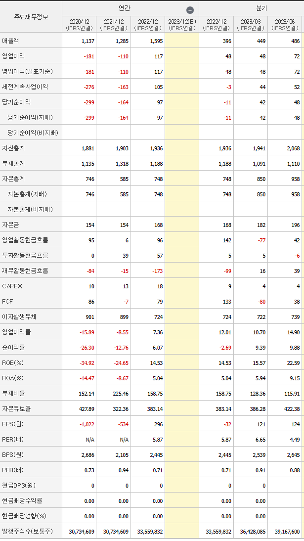 -매출은 22년 부터 흑자로 전환되어 꾸준한 매출, 영업이익 성장세를 보여주고 있습니다. 꾸준한 자산총계 증가와 조절가능한 부채총계로 보아 개선되고 있는 재무제표로 보여집니다. 또한 영업활동현금흐름 역시 늘고 있는 추세이며, ROE, ROA 증가와 PER이 5 정도로 보일 때 꾸준히 성장세를 보여주는 아직 고평가까지는 아닌 것으로 보여집니다.