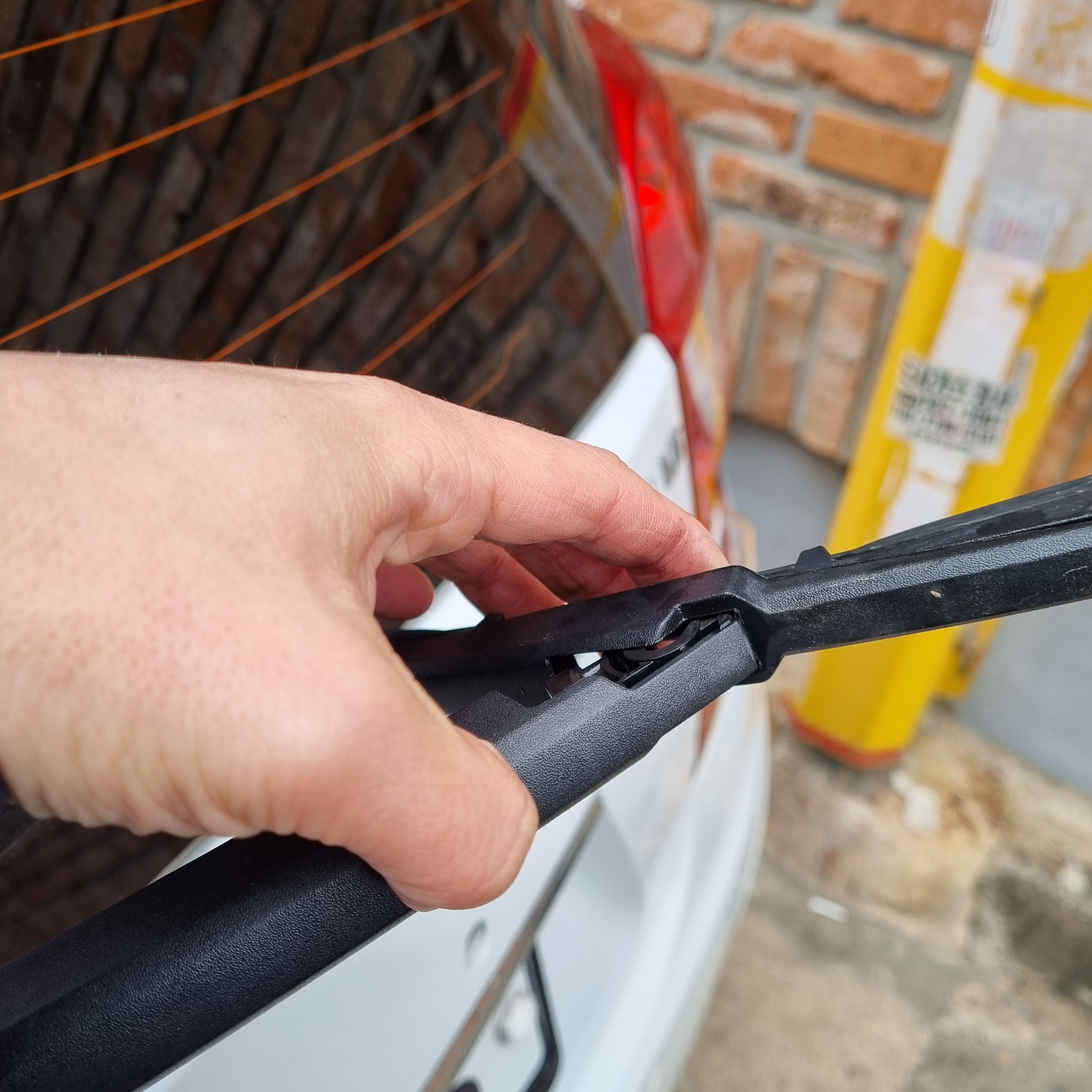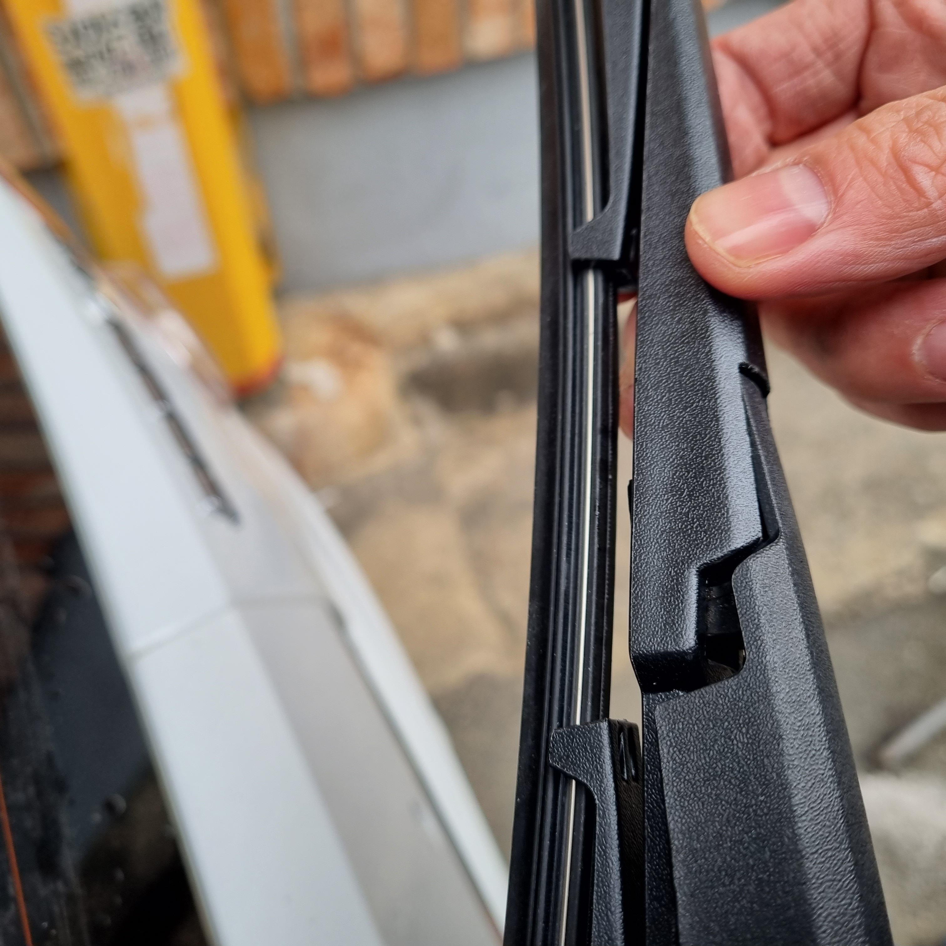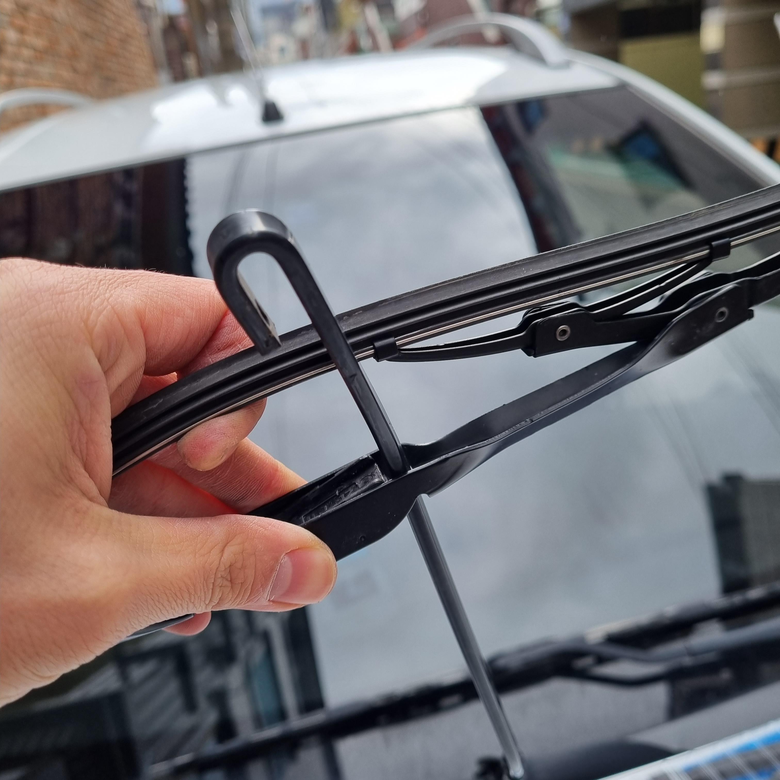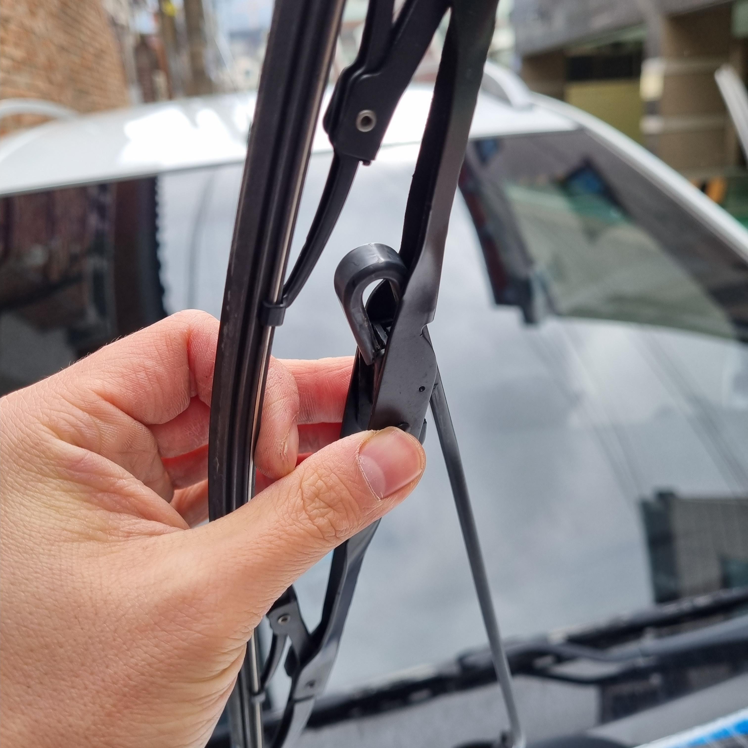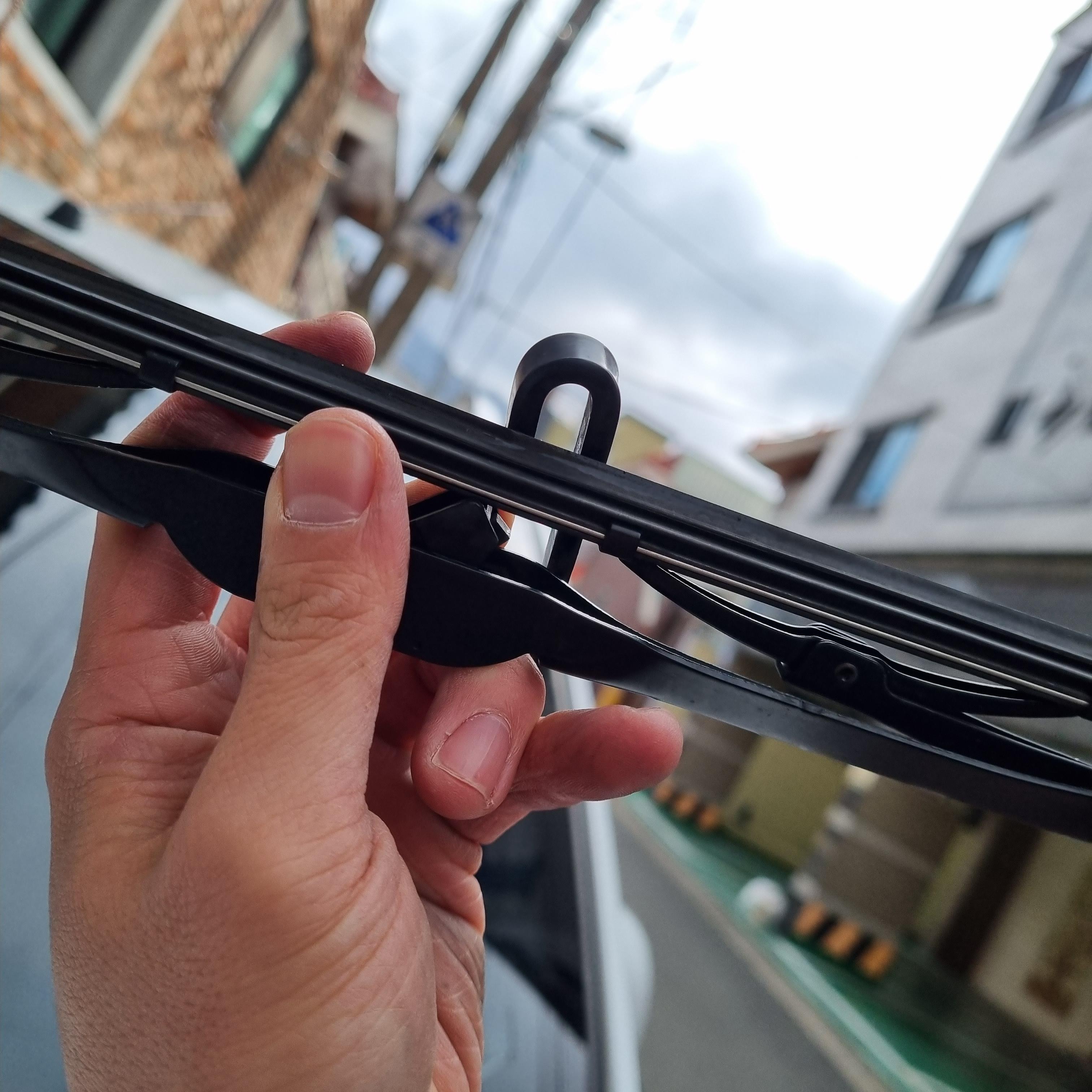 이렇게 꺾어준 상태에서 홈이 잡고 있기 때문에 차량 방향으로 밀어 빼주셔야 딱 소리 나면서 빠집니다. 너무 힘주면 파손될 수 있기 때문에 꺾어서 홈 방향보고 차량에 달린 본체는 꽉 잡고, 교체용 와이퍼를 흔들어줘야합니다.