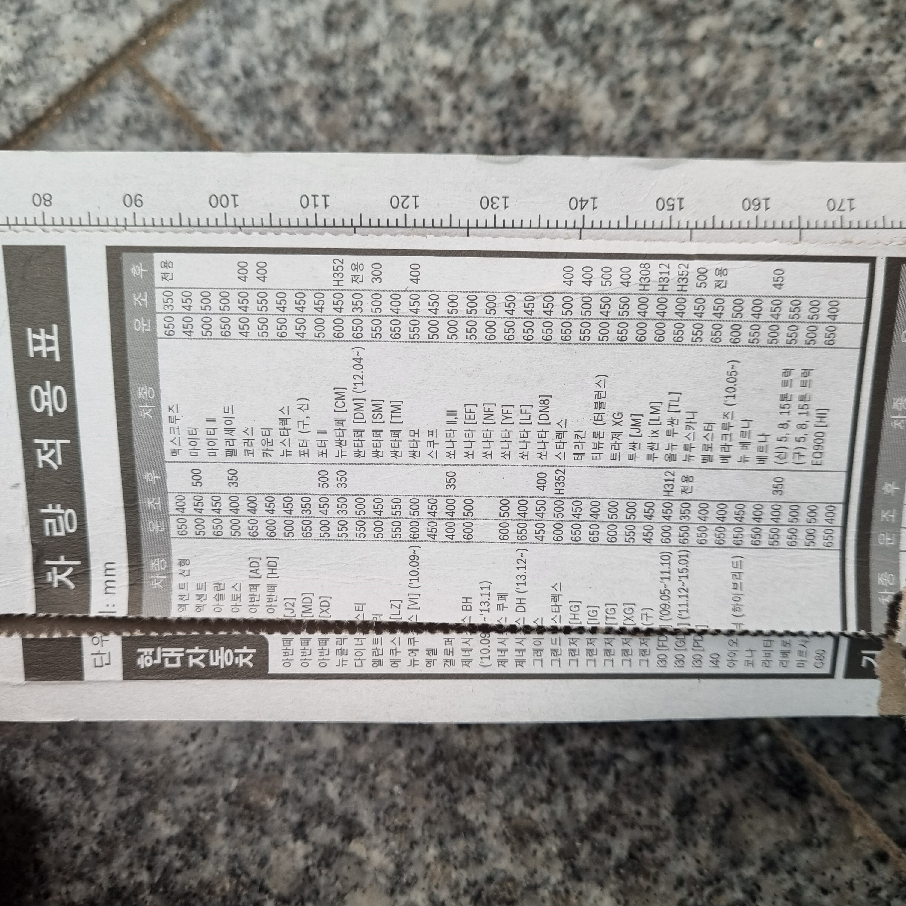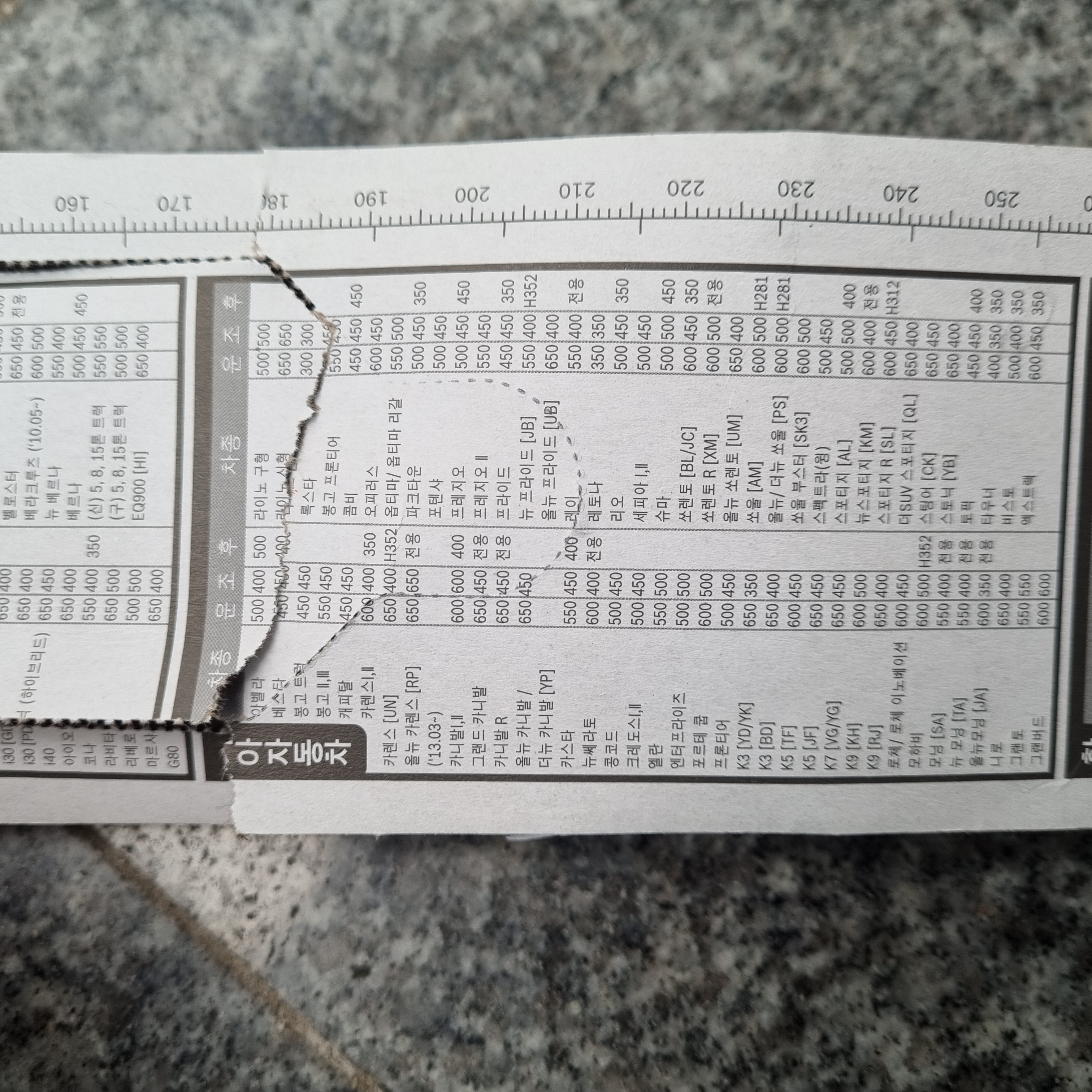 뜯다보니까 찢어져서 중간에 기아자동차는 조금 보기 힘드실 거 같은데요. 자동차별 와이퍼 사이즈를 적어둔 것이기 때문에 구매 전에 꼭 숙지하시기 바랍니다. 그리고 차량별 연식에 따라서도 조금 다르기 때문에 꼭 본인 차량 연식도 확인해서 찾으셔야합니다.