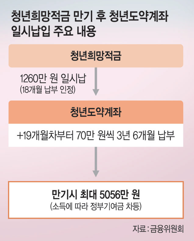 청년희망적금이 만기될 때까지 유지한 청년층이면서 청년도약계좌의 가입요건을 충족한 대상자라면 청년도약계좌에 원할하게 연계 가입을 할 수 있도록 청년희망적금 만기 수령금을 청년도약계좌를 가입하는 시점에 일시 납부할 수 있도록 하는 것입니다.