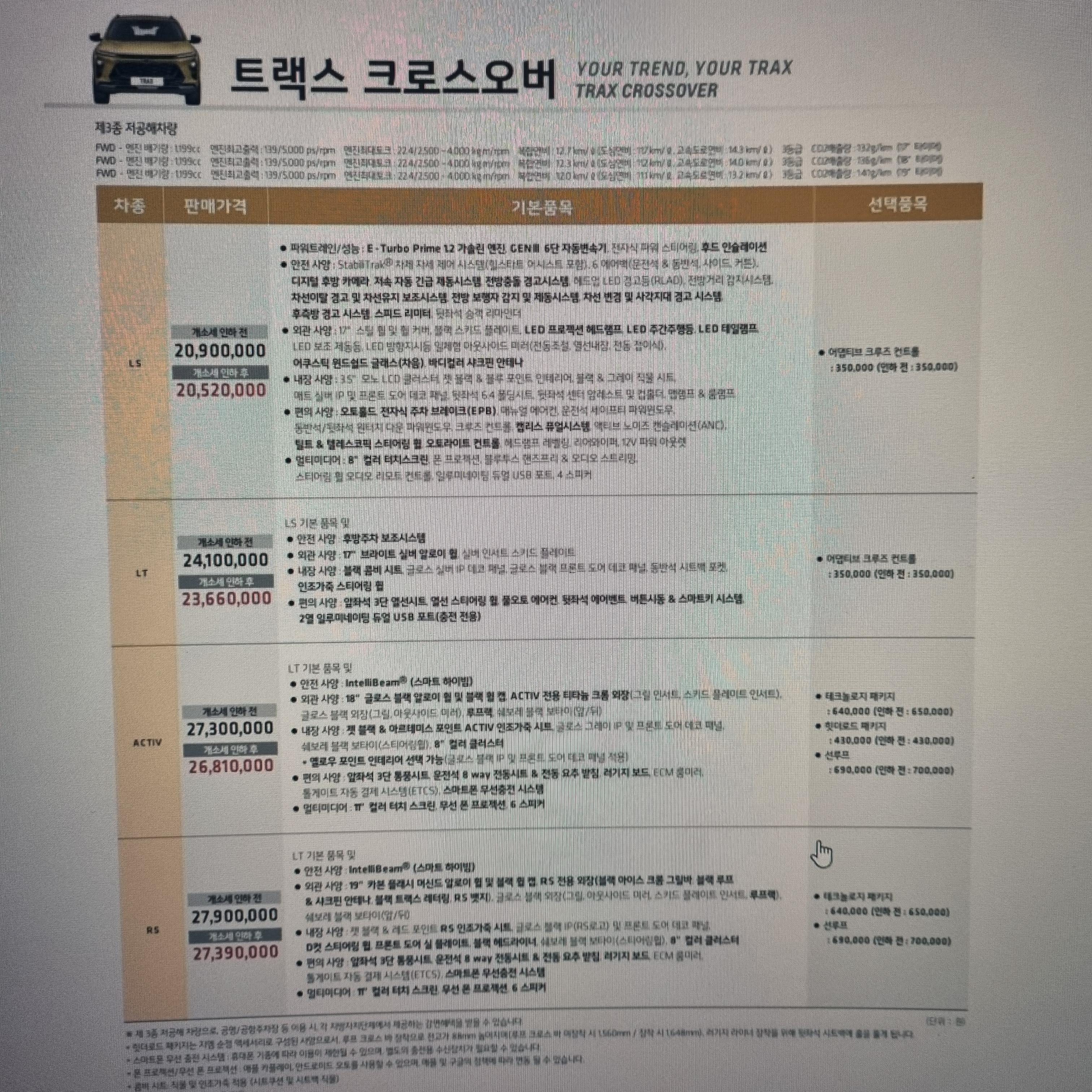 그래서 얼마 전에 트랙스 크로스 오버 액티브 트림 계약을 걸고 왔습니다. 매장에 갔을 당시에도 사람들이 꽤 있더라고요. 저는 트랙스 크로스오버 액티브 트림에 테크놀로지 패키지만 옵션으로 넣었습니다.