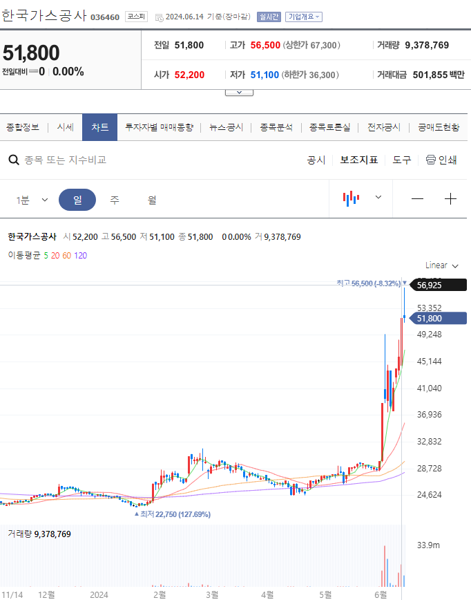 한국가스공사는 5월 기준으로 봐도 200%에 가까운 상승세를 보여주며 현재 최고점이라고 봐도 무방할 주가를 보여주고 있습니다.