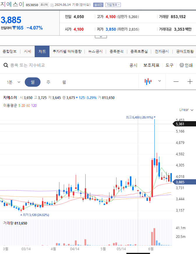 중앙에너비스도 4, 6월에 고점을 찍는 200% 상승세를 보여줬으나 현재 조정 후 이렇다할 힘이 없는 주가 모습을 보여주고 있습니다.