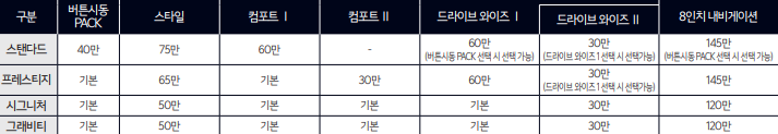 사실 높은 가격 대에 비해 캐스퍼, 모닝과 비교했을 때 더 준다는 느낌의 옵션은 없는 거 같습니다. 오히려 한 등급 위인 프레스티지 정도로 올라가면서 200만원 더 지불해야 될 거 같은 느낌이 드네요. 실제로 외장도 스타일이 다 주어지는 게 아니라 65만원을 지불해야 LED가 제공됩니다. 또한 프레스티지에서 눈에 띄는 옵션은 인조가죽시트, 앞좌석 열선시트, 운전석 통풍시트인 거 같습니다. 또한 운전석 시트 높이 조절 장치와 버튼 시동 스마트키 시스템(원격 시동 포함)이 추가로 얻는 옵션인 거 같습니다. 저정도면 200만원 줄 가치는 있다고 보여지지만 시작가가 너무 높아서 비싼 느낌을 지울 수 없습니다.