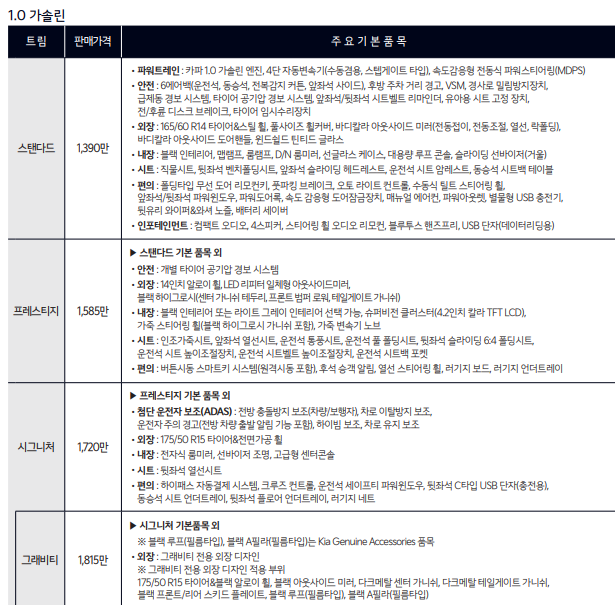 디자인, 수납능력을 제외하면 모닝, 캐스퍼와 비교했을 때 어떤 차이점이 있을까요? 차량 기본 시작가가 거의 1,300만원 이상인데 기본 트림에 어떤 외장, 내장재가 들어가 있는지 확인해보도록 하겠습니다. 제일 하위 트림은 스탠다드로 1,390만원으로 시작입니다.