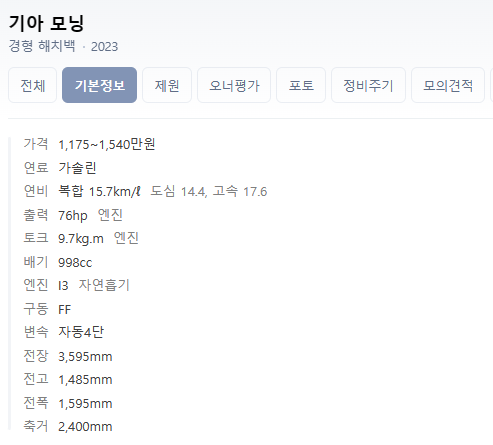 2023 모닝 제원 및 정보