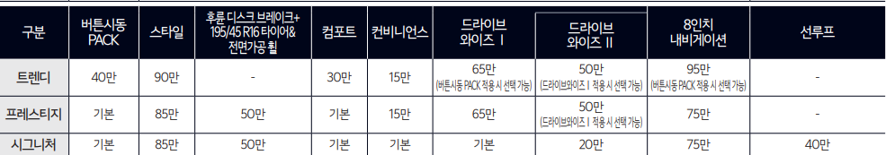 최근에 나온 쉐보레 트랙스 크로스오버 같은 경우에는 기본 안전 ADAS 기능과 계기판이 있는클러스터를 기본 제공했는 것을 감안하면 옵션질이 들어간 듯한 느낌이 많이 듭니다. 기본 트림을 할바에는 프레스티지로 올라가서 LED, 슈퍼비전 클러스터, 앞좌석 열선시트, 운전석 통풍시트를 가져가는 것이 나을 거 같습니다.