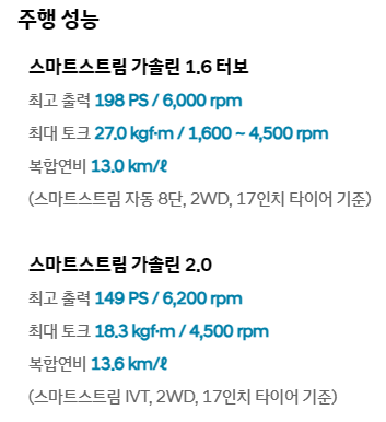 스마트스트림 가솔린 2.0의 경우 최고 출력 149PS/6,200rpm, 최대 토크 18.3kg.f.m/4,500rpm 입니다. 복합연비는 13.6km/L 입니다.