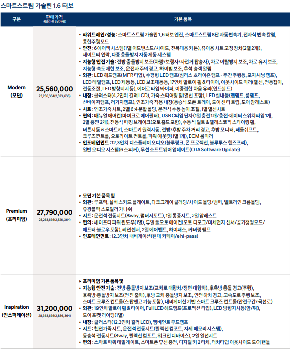 위의 옵션들이 추가되며 약 250만원이 추가됩니다. 개인적으로 시트에 1열 통풍시트가 워낙 넘사벽 옵션이다 보니 프리미엄까지는 와야 하지 않나 싶습니다. 인스퍼레이션 옵션은 거의 풀옵션이기 때문에 위의 트림 가격표 사진을 살펴보시면 될 거 같습니다. 프리미엄 등급의 경우 전방 충돌방지 보조, 스마트 크루즈 컨트롤, 클러스터(12.3인치 컬러 LCD), 앰비언트 무드램프, 2열 열선시트, 스마트 테일게이트 등이 있어서 너무 매력적인 옵션들이 많이 있는 거 같습니다.
