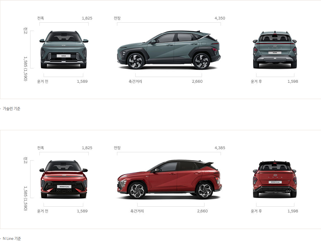 이전 코나의 전장이 4,205mm, 전폭 1,800mm, 전고 1,550mm이었던 것을 생각하면 가로, 세로, 높이 모두 더 커진 것을 볼 수 있습니다.
