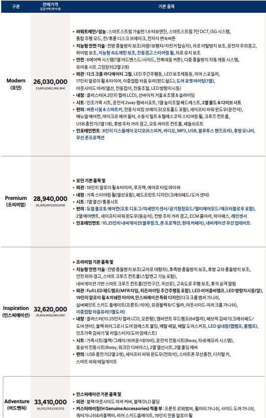 기본 트림인 모던의 경우 2600만원부터 시작합니다. 기본 트림에서 기본적인 옵션들은 주기 때문에 깡통만 타겠다하면 2790만원에 출고가 가능합니다.