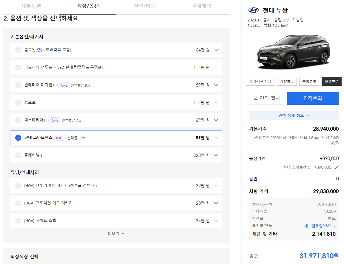 2번째 견적은 위에서 말씀드린 좀 더 괜찮은 옵션이 들어간 프리미엄 옵션에 운전 보조 기능 현대 스마트 센스만 추가한 견적입니다. 출고가는 약 3197만원입니다. 오래 탈 생각에 괜찮은 옵션 안고 가려는 분들에게 추천드립니다.