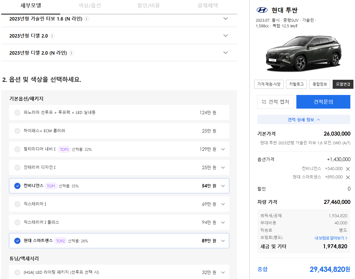첫번째 견적은 기본 트림인 모던에 컨비니언스(운전석 전동시트, 동승석 전동시트, 2열 열선시트, 스마트 파워 테일게이트 USB 충전기, 2열 폴딩 레버 등)와 스마트 센스(반 자율주행 및 운전 보조)가 들어간 가성비 견적입니다. 출고가가 2943만원 정도이니 트랙스 크로스오버와 비슷한 느낌입니다.