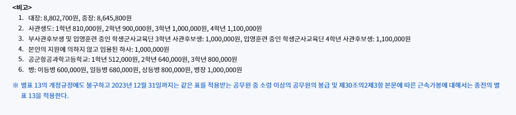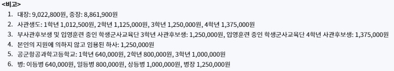 • 부사관 후보생 및 입영훈련 중인 학생군사교육단 3학년 사관후보생 : 1,250,000원