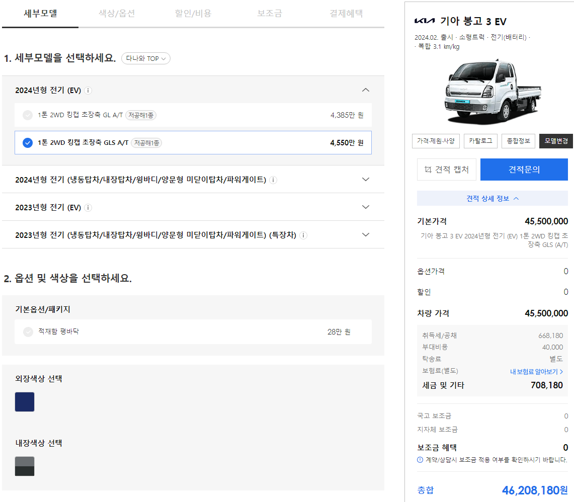 먼저 2024 봉고3 EV 모의견적을 GLS 트림으로 낼 경우 약 4620만원입니다. 다만 지자체 보조금이 각각 다르다보니 해당 지자체 보조금을 조회해보시고 그나마 지원을 받아서 구입하시는 걸 추천드립니다.