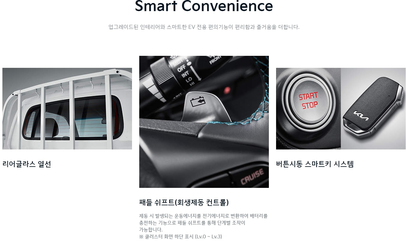 또한 겨울철 유일한 후방 유리가 얼어서 곤란한 경우가 많습니다. 특히나 수직형 창문인 점을 감안하면 매우 불편한 부분입니다. 리어 글라스 열선을 통해 불편한 점을 해소하고 회생제동 컨트롤이 가능한 패들 쉬프트를 통해서 제동 시 발새오디는 운동에너지를 전기에너지로 변환하여 배터리를 충전하는 기능으로 패들 쉬프트를 통해 단계별로 조작 가능하다고 합니다.