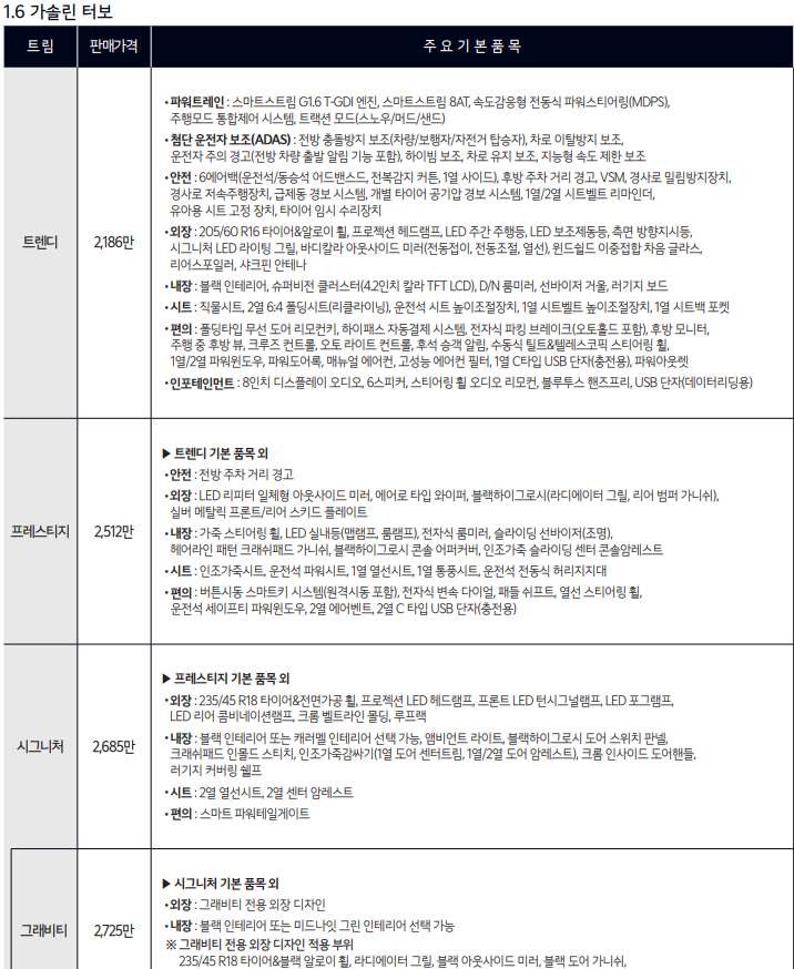 ■2024 셀토스 트림별 가격 및 옵션 특징(1.6 가솔린 기준)