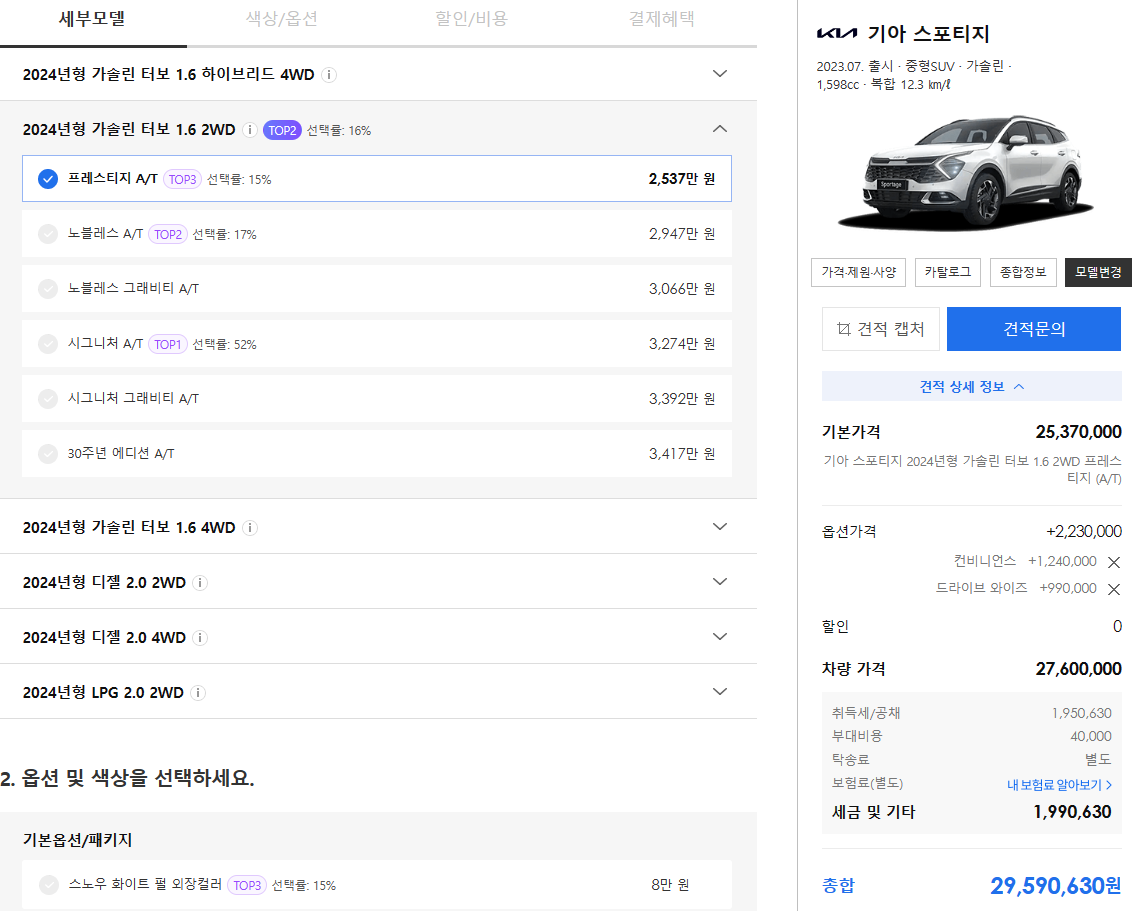 2023 스포티지 견적을 2개 정도 뽑아보았습니다. 첫 견적은 기본 트림인 프레스티지에 컨비니언스(도어손잡이 조명, 운전석 파워시트, 1열 열선, 통풍시트, 운전석 전동식 허리지지대, 버튼 시동 스마트키 시스템 등), 드라이브 와이즈(주행 보조 기능 ADAS)를 추가한 옵션입니다. 출고가는 취득세 포함한 2959만원입니다.