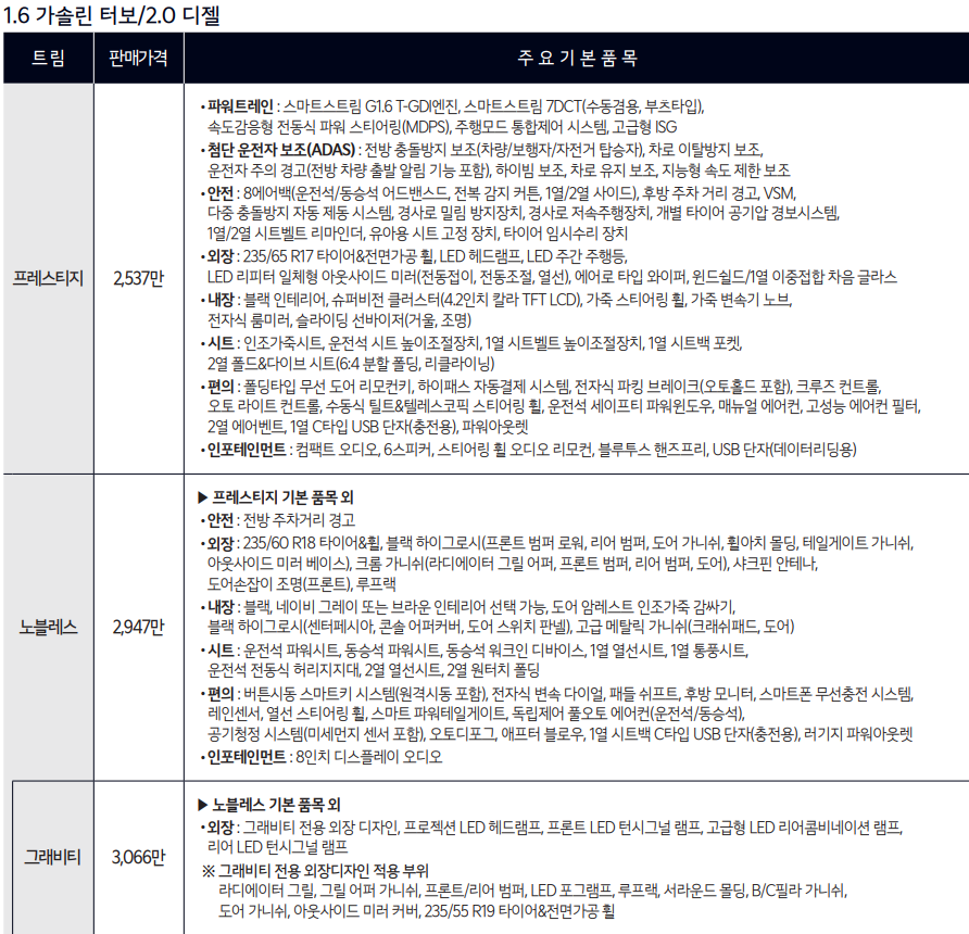 ●2023 스포티지 트림별 가격 및 옵션 특징