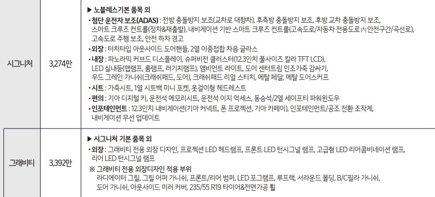 그래비티 트림의 경우 외장과의 차이만 있고, 시그니처부터 왠만한 첨단 운전자 보조(ADAS), 파노라믹 커브드 디스플레이, 슈퍼비전 클러스터, 12.3인치 내비게이션등이 제공되어 좀 더 고급진 외, 내장을 이용할 수 있을 거 같습니다. 본인의 운전 성향, 환경, 출퇴근 거리 등을 감안하여 본인에게 맞는 옵션등을 고려해서 구매하시면 어떨까 싶습니다.