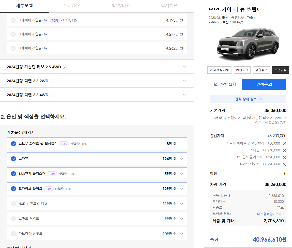 오늘은 2024 쏘렌토 제원, 정보 및 모의견적을 살펴보았습니다. 물가만큼 오른 기본 트림에서 충분히 가성비 좋은 옵션들이 포함되어 깡통만으로 경쟁력 있다고 느껴지네요. 오늘은 여기까지