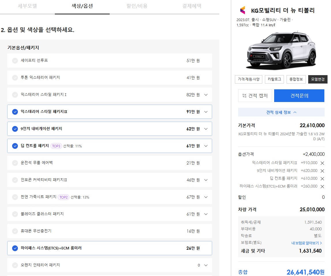 두번째 견적은 V3에 익스테리어 스타일, 9인치 내비게이션 패키지, 딥 컨트롤 패키지, 하이패스 시스템을 적용하여 출고가 2664만원에 가능합니다. 소형 SUV가 요즘 2천만원 후반에서 3천만원에 육박하는 것을 가정하면 충분히 경쟁력 있는 상품이지않나 싶습니다.