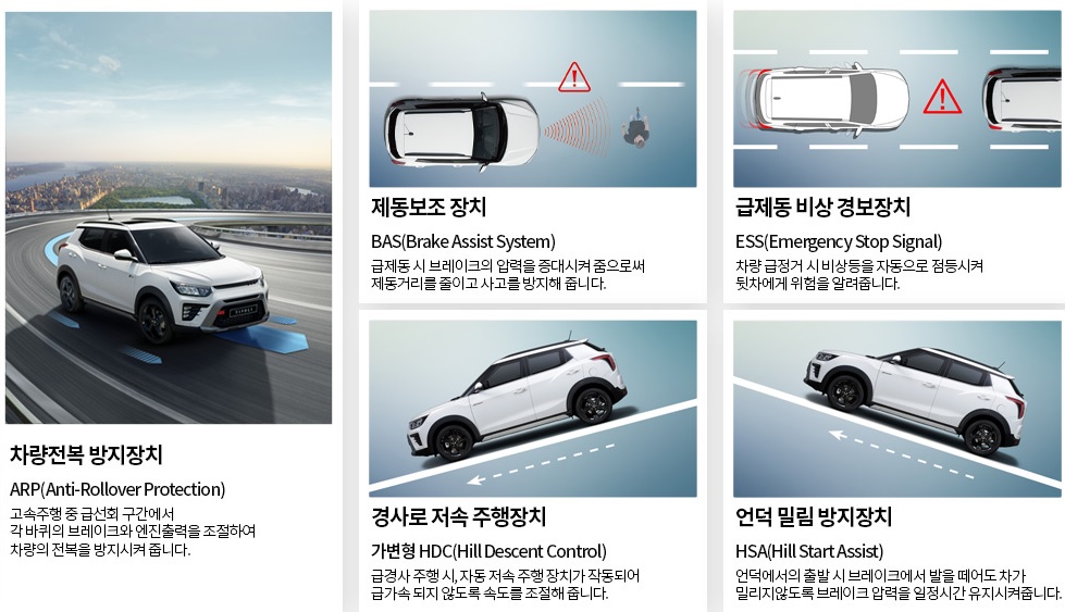 • 안전 사양 : 6에어백, 후방 주차 보조 경고, 타이어 공기압 경보 시스템 등