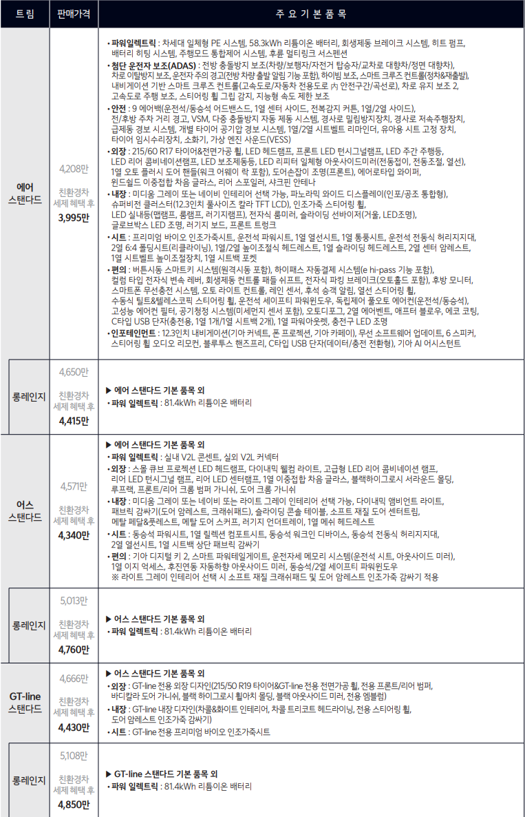 - 파워일렉트릭 : 58.3kWh 리튬이온 배터리, 배터리 히팅 시스템, 주행 모드 통합제어 시스템