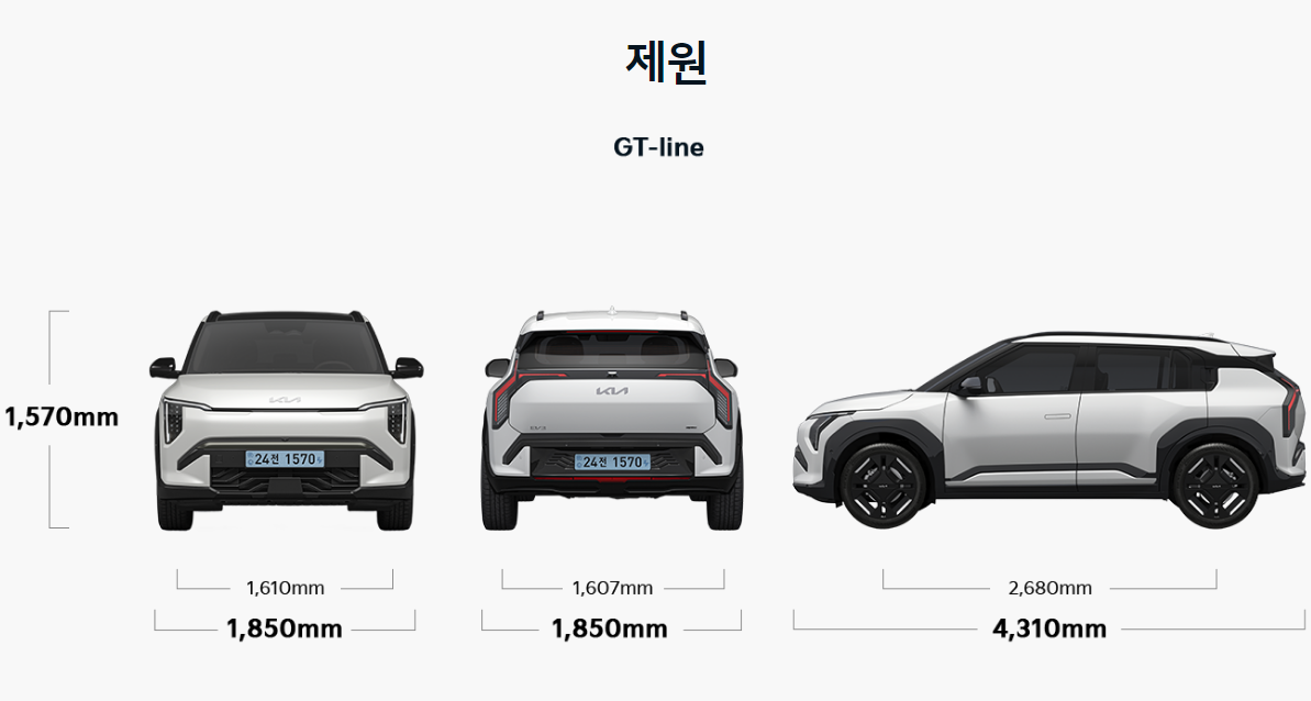 2025 EV3 GT-line의 경우 전장 4,310mm, 전폭 1,850mm, 전고 1,570mm, 휠베이스 2,680mm입니다. 모터 최고 출력은 150kW, 모터 최대 토크는 283Nm로 두 모델 모두 동일합니다.