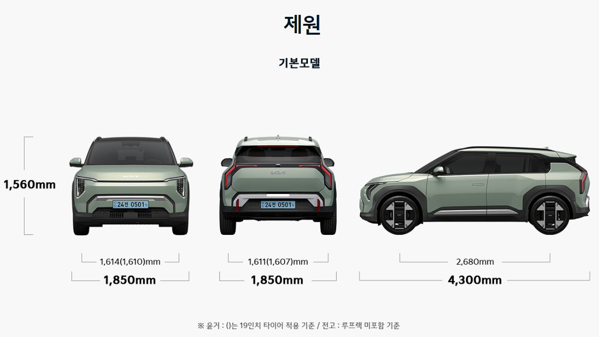 제원은 크게 2가지로 나눠볼 수 있습니다. 우선은 EV3 기본 모델은 제원은 전장 4,300mm, 전폭 1,850mm, 전고 1,560mm, 휠베이스 2,680mm입니다. 셀토스, 코나 크기 정도라고 생각하시면 될 거 같습니다.